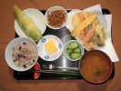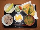 お赤飯(ごま塩)、味噌汁(豆腐、なめこ、三つ葉)、天ぷら盛り合わせ(天つゆ、さつま芋、かぼちゃ、ピーマン、パプリカ赤・黄、茄子、ししとう、ミニトマト、竹輪いそべ)、ブロッコリーの胡麻ドレ和え(ミニトマト)、厚焼きたまご、フルーツ:メロン |