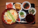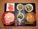 まぐろすきみ丼(キュウリわさび乗せ)、味噌汁(白菜、しめじ、あげ)、ほうれん草となめ茸・大和芋和え、いんげんの胡麻和え、キュウリ中華炒め、フルーツ:大玉のスイカ |