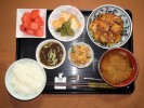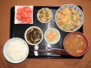 ごはん、味噌汁(茄子、あげ、みょうが)、アジフライ(千切りキャベツ、特製ソース)、仙台ふのたまごとじ(万能ネギ)、ブロッコリーの胡麻ドレ和え、キュウリなめ茸和え、フルーツ:大玉スイカ |