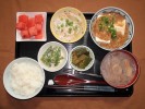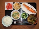 ごはん、味噌汁(おふ、わかめ、ネギ)、チリ産の鮭の塩焼き、野菜のたまごとじ(キャベツ、人参、玉ネギ、椎茸、恵壽卵)、揚げ出し豆腐(大根おろし、刻みオクラ)、キュウリの梅しそ漬け、フルーツ:大玉スイカ |