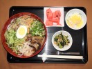 冷やしうどん(細うどん、キュウリ、椎茸、カニカマ、煮あげ、あげ玉、煮たまご、カイワレ、万能ネギ、みょうが)、うの花(人参、グリンピース、あげ、さつま揚げ、竹輪、長ネギ、たまご)、じゃが芋の粉ふき煮、キュウリ漬け、フルーツ:大玉スイカ |