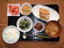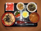 ごはん、味噌汁(白菜、あげ)、ほっけ塩焼き、うの花(人参、長ネギ、あげ、竹輪、さつま揚げ、グリーンピース、たまご)、酢の物(キュウリ、ワカメ、カニカマ)、うずら豆煮、フルーツ:大玉スイカ |