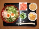 いなり寿司(大根の醤油漬け)、七夕そうめん(椎茸、キュウリ、星型厚焼き玉子、ハート型人参)、万能ネギ、みょうが、酢の物(キュウリ、ワカメ、カニカマ)、トマトわさび醤油漬け(刻み海苔)、フルーツ:大玉スイカ |