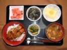 ロースかつ丼(豚ロースかつ、玉ネギ、たまご、グリーンピース)、味噌汁(茄子、あげ、みょうが)、トマトのわさび醤油和え(刻み海苔)、キュウリ中華炒め、白花のいんげん豆煮、フルーツ:大玉スイカ |