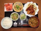 あさりごはん、味噌汁(茄子、あげ、みょうが)、干しエビと玉ねぎのかき揚げあんかけ、田舎煮(大根、人参、こんにゃく、竹輪、あげ、さつま揚げ、椎茸)、水菜のおひたし(おかか)、キュウリの中華炒め、フルーツ:大玉スイカ |