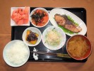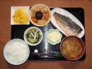 ごはん、味噌汁(茄子、あげ、みょうが)、いなだ白醤油焼き(大葉)、茄子とピーマンの炒め煮(白すり胡麻)、白花いんげん豆煮、キュウリ梅しそ漬け、フルーツ:バナナ(ブルーベリーソースがけ) |