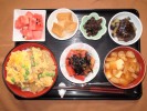かつ丼(豚ロース、玉ネギ、たまご、グリーンピース)、味噌汁(豆腐、あげ、みょうが)、茄子の胡麻味噌田楽、厚揚げ煮、トマトのわさび醤油和え(刻み海苔)、ゴーヤの佃煮、フルーツ:スイカ |