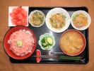 まぐろ丼(寿めし、刻み海苔、キュウリわさび乗せ)、味噌汁(白菜、椎茸、あげ)、豚肉と大根煮(グリーンピース)、ゴーヤ炒め(豚肉、たまご)、水菜のおひたし(おかか)、キュウリ梅しそ漬け、フルーツ:大玉スイカ |