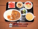 ポークカレー(豚肉、じゃがいも、人参、玉ネギ、福神漬け)、オニオンコンソメスープ(パセコン)、コールスローサラダ(キャベツ、人参、キュウリ、ミニトマト)、煮たまごのあんかけ(黒ごま)、キュウリ辛子漬け、ゴーヤ佃煮、フルーツ:大玉スイカ |