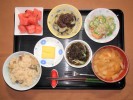 五目釜飯風ごはん、味噌汁(豆腐、あげ、みょうが)、ソフト揚げ和風ソースがけ(大根おろし、刻みオクラ、なめ茸)、茄子のごま味噌田楽、もずく酢(キュウリ)、厚焼きたまご。フルーツ:大玉スイカ |