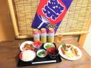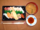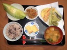 お赤飯(ごま塩)、味噌汁(豆腐、椎茸、三つ葉)、天ぷら盛り合わせ(天つゆ、さつま芋、かぼちゃ、ピーマン、パプリカ赤、茄子、オクラ、竹輪いそべ)、金平ごぼう(白すり胡麻)、厚焼きたまご、フルーツ:メロン |