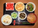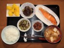ごはん、味噌汁(豆腐、あげ、みょうが)、鮭の塩焼き(チリ産)、茄子の胡麻味噌田楽、もずく酢(キュウリ)、うずら豆煮、フルーツ:小山田産スイカ |