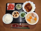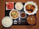 ごはん、味噌汁(大根、しめじ、あげ)、まぐろかつ(千切りキャベツ)、マカロニサラダ(人参、キュウリ、ロースハム)、車ふのたまごとじ(三つ葉)、うずら豆煮、フルーツ:大玉スイカ |