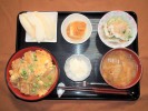 ロースかつ丼(豚ロースかつ、玉ネギ、たまご、グリーンピース)、味噌汁(白菜、しめじ、あげ)、酢の物(もやし、キュウリ、竹輪、白すり胡麻)、豆腐なめ茸がけ、大和芋の梅しそ漬け、フルール:稲城梨 |