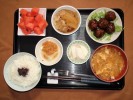 ゆかりごはん、味噌汁(たまねぎ、たまご)、ミートボール中華甘酢あんかけ(水菜)、豚肉と大根煮、豆腐なめ茸がけ、大和芋のうめし漬け、フルーツ:秋田県産大玉スイカ |
