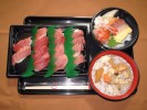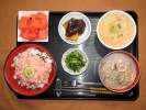 まぐろすきみ丼(寿めし、刻み海苔、キュウリわさびのせ)、味噌汁(茄子、あげ、みょうが)、かぼちゃいと子煮、とうがんのカニカマあんかけ(グリーンピース)、菜の花の辛子和え、フルーツ:大玉スイカ |