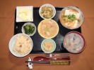 さつま芋ごはん、豚汁(豚肉、人参、大根、ごぼう、こんにゃく、里芋、しめじ、長ネギ、豆腐)、ほっけの塩焼き(ししとう添え)、一口がんもの含め煮、酢の物(もやし、キュウリ、竹輪、白すり胡麻)、茄子のあげびたし(おかか)、ゆで栗、フルーツ:バナナ(クリーム添え) |