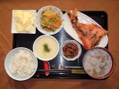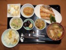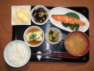 ごはん、味噌汁(大根、しめじ、あげ)、チリ産の鮭の塩焼き(大葉、ししとう)、ひじき煮、煮やっこ(万能ネギ)、キュウリ中華炒め、フルーツ:リンゴ(ジョナゴールド) |
