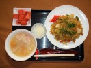 豚肉、キャベツ、もやし、ピーマン、人参、青のり、紅生姜、野菜コンソメスープ(ベーコン、人参、キャベツ、玉ネギ)、大根のべったら漬け、フルーツ:大玉スイカ |