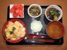 親子丼(とり肉、玉ネギ、なると、たまご、三つ葉)、味噌汁(大根、椎茸)、茄子の揚げびたし(万能ネギ)、もずく酢(キュウリ)、大根のべったら漬け、フルーツ:大玉スイカ |
