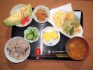 お赤飯(ごま塩)、味噌汁(豆腐、なめこ、三つ葉)、天ぷら盛り合わせ(天つゆ、さつま芋、かぼちゃ、ピーマン、れんこん、茄子、ししとう、パプリカ赤、竹輪いそべ)、れんこん・ごぼうの金平(白すり胡麻)、厚焼き玉子、キュウリとみょうがの梅しそ漬け、フルーツ:メロン、さくらんぼ |