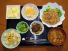 ごはん、味噌汁(茄子、あげ、みょうが)、豆腐ハンバーグ(とり挽肉、玉ネギ)の和風ソース(大根おろし、なめ茸、刻みオクラ)がけ、かぼちゃいとこ煮、菜の花の辛子和え、長芋の梅しそ漬け、フルーツ:リンゴ |