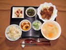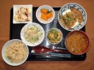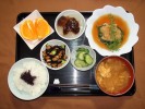 とり釜飯風ごはん、味噌汁(茄子、あげ、みょうが)、豆腐ととり挽肉あんかけ(万能ネギ)、とうがんカニカマあんかけ(グリーンピース)、ゴーヤ炒め(豚肉、玉子)、菜の花の辛子和え、白花いんげん豆煮、フルーツ:リンゴ |