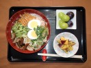冷やしうどん(細うどん、キュウリ、あげ玉、カニカマ、煮あげ、煮椎茸、ゆで玉子、カイワレ、みょうが、万能ネギ)、大学芋(黒ごま)、フルーツ:リンゴ |