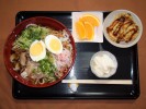 冷やしうどん(細うどん、キュウリ、あげ玉、カニカマ、煮あげ、煮椎茸、ゆで玉子、カイワレ、みょうが、万能ネギ)、ミニお好み焼き(特製ソース)、長芋の梅しそ漬け、フルーツ:オレンジ |