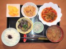 ごはん、味噌汁(とうがん、椎茸)、豚肉の生姜焼き(水菜)、かぼちゃいとこ煮、ほうれん草のなめ茸和え、柚子大根のしぼり漬け、フルーツ:種なし柿 |