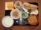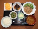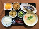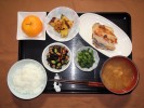 ごはん、味噌汁(玉ねぎ、たまご)、ほっけの塩焼き(大根おろし甘酢しょうが、ししとう)、キャベツのおひたし(おかか)、さつま芋のレモン煮(レーズン)、キュウリとみょうがの梅しそ漬け、フルーツ:和歌山県種なし柿 |