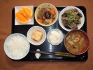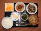 ごはん、味噌汁(白菜、椎茸、あげ)、豚肉と茄子のポン酢炒め、田舎煮(大根、人参、椎茸、あげ、竹輪、さつま揚げ)、厚焼きたまご、もずく酢、フルーツ:和歌山県産種なし柿 |