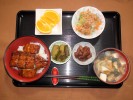 さんまの蒲焼き、味噌汁(豆腐、あげ、ワカメ、長ネギ)、キャベツのおひたし(人参、三つ葉、おかか)、キュウリの中華炒め、うづらの豆煮、フルーツ:プレミアムオレンジ |