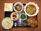 ゆかりご飯、味噌汁(白菜、椎茸、松山あげ)、揚げシューマイの甘酢あんかけ(ピーマン、パプリカ赤・黄)、豚肉と大根炒め煮、茄子の揚げびたし(三つ葉)、ちりめんじゃこの釜揚げ、フルーツ:種なし柿 |
