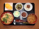 親子丼(とり肉、玉ネギ、なると、たまご、三つ葉)、味噌汁(白菜、あげ)、大根のごま味噌田楽、もずく酢(キュウリ)、うずら豆煮、大根のぬかしぼり柚子漬け、フルーツ:種なし柿 |