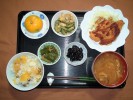 さつま芋ごはん、味噌汁(豆腐、しめじ、あげ、長ネギ)、ほっけ塩焼き(大根おろし、甘酢しょうが)、仙台ふのたまごとじ(万能ネギ)、菜の花の辛子和え、キュウリとみょうがの梅しそ漬け、フルーツ:リンゴ |