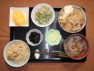 あさりご飯、味噌汁(茄子、あげ、みょうが)、すき焼き風煮(豚肉、白菜、しらたき、椎茸、おふ、豆腐、長ネギ)、ソフト揚げの和風ソースがけ(大根おろし、なめ茸、刻みオクラ)、黒豆煮、大根のべったら漬け、フルーツ:奈良県産の種なし柿 |
