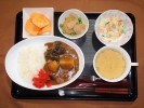 茄子ポークカレー(福神漬け、豚肉、玉ネギ、人参、ジャガイモ、揚げ茄子)、コンソメオニオンスープ(パセコン)、コールスローサラダ(キャベツ、人参、キュウリ)、里芋煮っころがし(グリーンピース)、フルーツ:次郎柿 |