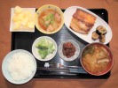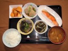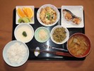 ごはん、味噌汁(大根、しめじ、あげ)、チリ産の鮭の塩焼き、里芋煮(グリーンピース)、茄子の揚げびたし(万能ネギ)、もずく酢(キュウリ)、フルーツ:柿 |
