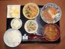 ごはん、味噌汁(白菜、しめじ、あげ)、アジフライ(千切りキャベツ、特製ソース)、かぼちゃ含め煮、ほうれん草となめ茸和え、長芋の梅しそ漬け、フルーツ:ふじリンゴ |