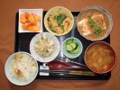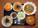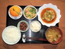 さつま芋ごはん、味噌汁(白菜、しめじ、あげ)、豆腐挽肉あんかけ(万能ネギ)、野菜たまごとじ(キャベツ、人参、玉ネギ、椎茸、たまご、三つ葉)、酢の物(もやし、キュウリ、竹輪、白すり胡麻)、キュウリ梅しそ漬け、フルーツ:柿 |