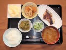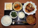 ごはん、味噌汁(白菜、椎茸)、ぶりの照り焼き、ブロッコリーの胡麻ドレ和え、竹輪・さつま揚げ・ソフト揚げの煮物、大根葉ふりかけ(おかか、白すり胡麻)、フルーツ:リンゴ |