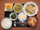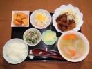 あさりご飯(刻み海苔)、味噌汁(玉ねぎ、たまご、万能ネギ)、豆腐野菜ハンバーグ(和風ソースがけ:根おろし、刻みオクラ、なめ茸)、田舎煮(大根、人参、こんにゃく、椎茸、竹輪、さつま揚げ)、うずら豆煮、はやとうりの梅しそ漬け、フルーツ:みかん |