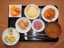 ごはん、味噌汁(豆腐、あげ、しめじ、長ネギ)、八宝菜(豚肉、白菜、人参、たまネギ、しいたけ、たけのこ、ピーマン、あさり、イカ、エビ)、豚肉と大根炒め煮(大根葉)、ほうれん草となめ茸和え、だし巻きたまご、フルーツ:ネーブルオレンジ、キウイフルーツ |