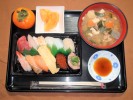 お赤飯(ごま塩)、味噌汁(豆腐、なめこ、三つ葉)、天ぷら盛り合わせ(天つゆ、さつま芋、かぼちゃ、れんこん、ピーマン、パプリカ赤、茄子、いんげん、竹輪いそべ)、金平ごぼう(白すり胡麻)、厚焼きたまご、フルーツ:メロン、チェリー |
