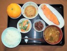 ごはん、味噌汁(白菜、しいたけ、あげ)、チリ産の鮭の塩焼き、がんも含め煮、小松菜の胡麻和え(人参、かまぼこ)、うずら豆煮、フルーツ:杉井さんちのみかん |