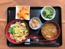 かつ丼(豚ロースかつ、玉ネギ、たまご、三つ葉)、味噌汁(豆腐、あげ、ワカメ、長ネギ)、とうがんカニカマあんかけ(グリーンピース)、ほうれん草・なめ茸和え、キュウリとみょうがの梅しそ漬け、フルーツ:ときリンゴ |