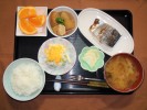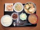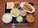 ごはん、味噌汁(玉ねぎ、たまご)、ほっけ塩焼き、金平ごぼう(白すり胡麻)、中華風白菜のおひたし(白すり胡麻)、白花いんげん豆、大根漬物、フルーツ:リンゴ |