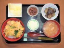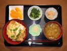親子丼(とり肉、玉ネギ、なると、たまご、三つ葉)、味噌汁(白菜、あげ)、茄子胡麻味噌田楽、大和芋梅しそ漬け、うずら豆煮、フルーツ:リンゴ |