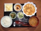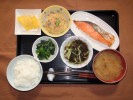 ごはん、味噌汁(白菜、しめじ)、鮭(チリ産)の塩焼き、うの花(あげ、竹輪、さつま揚げ、人参、椎茸、長ネギ、たまご、むき枝豆)、ほうれん草なめ茸和え、もずく酢(キュウリ)、フルーツ:生パイナップル |